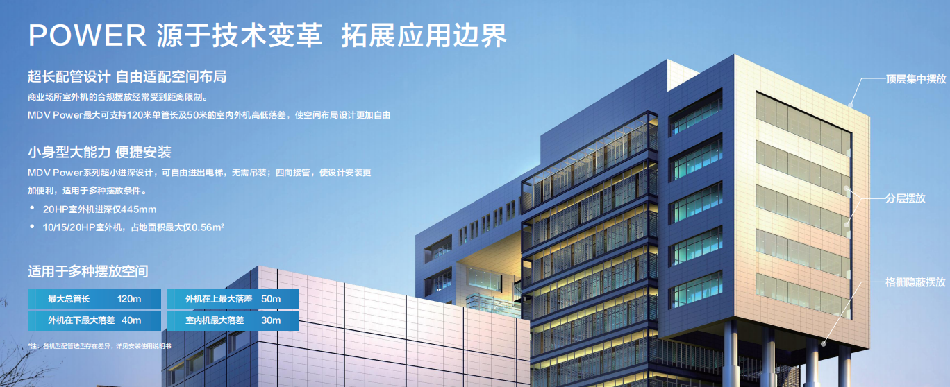 美的MDV Power系列轻型商用空调,POWER系列,源于技术变革,拓展应用边界,超长配管设计 自由适配空间布局。