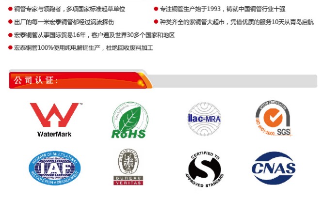宏泰从1993年开始一直专注于紫铜管系列产品的研发和生产,是高精度清洁R410A铜管、给排水铜管、内螺纹铜管、蚊香型盘管、医疗气体用铜管、外径54毫米以上大口径铜直管、暖气片铜管、保温铜管、覆塑铜水管、毛细铜管等紫铜管的生产专家和领跑者,宏泰铜管被广泛应用于空调主机,中央空调或多联机空调,冰箱、冰柜,太阳能,散热器,导电,健康饮用水、地暖安装工程,医疗器械厂和造船厂等。