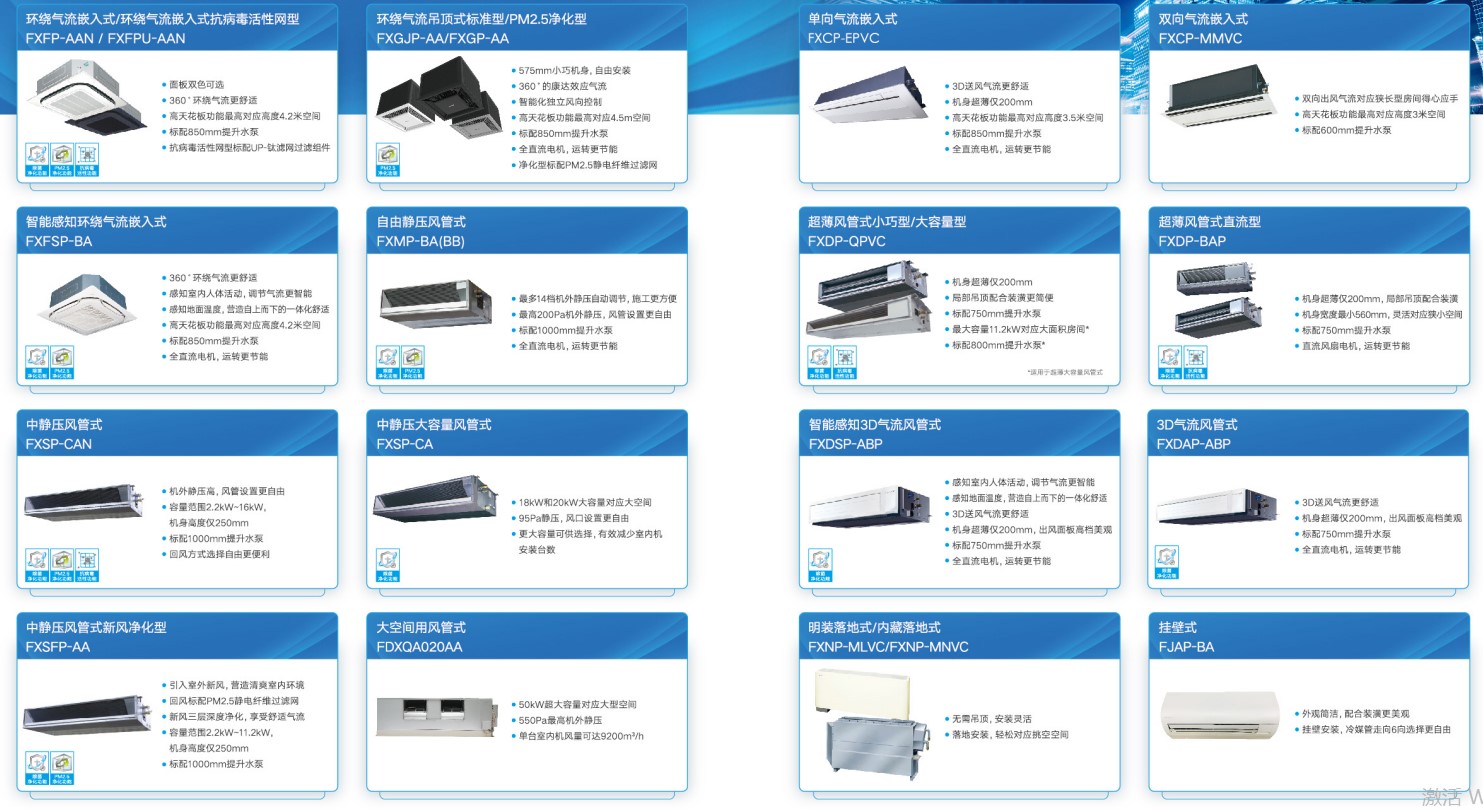 •大容量小巧型空调系统:室外机单台容量8HP-22HP以2HP为单位递增。单套空调系统最大容量可达B8HP。现代化建筑寸土寸金,大金中央空调系统高度集成,外机小巧,力求实现建筑物空间利用率最大化。