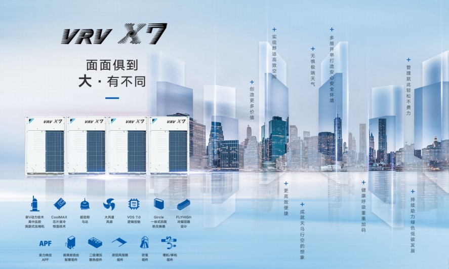 •VOS 7.0 控制逻辑全面升级 享受更舒适的节能:大金VRVX7系列空调系统,搭载大金最新VOS7.0控制逻辑。不同于常见多联机的控制逻辑(室内外机联动控制逻辑),突破性的实现了全新控制逻辑:室内外机+多台室内机之间的联动控制逻辑。实时监测室内空调负荷的动态变化,联动自适应调节冷媒流量、冷温度、各台室内机循环风量、室外机循环风量,辅以优化后的曲轴加热控制技术,进一步提升了空调系统节能性的同时,还显著提升了空调使用舒适性,避免室内温度波动过大。