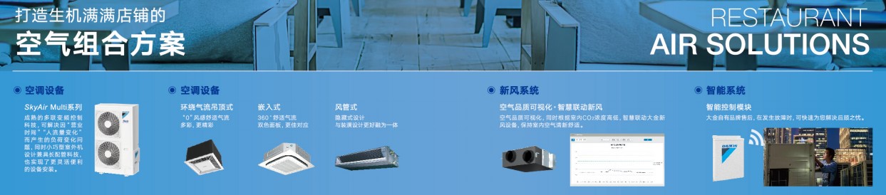 •公共空间空气问题往往更加复杂:空气品质问题,已经成为全民热议的话题无论是办公室、4S店铺、工厂还是餐饮等都由于人群相对集中、空气不流通等问题,容易造成室内污染深耕研究空气领域90余年的大金提供更专业、更有针对性的空气综合解决方案。