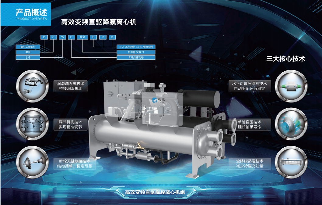 突破科技,成就梦想。美的鲲禹高效变频直驱降膜离心机突破多项行业技术瓶颈,研发了水平对置、单轴直驱、全降膜蒸发等具有国际领先水平的核心技术,突破了小冷量段瓶颈,提升了项目可选性,成为城市供冷更高效节能的选择。