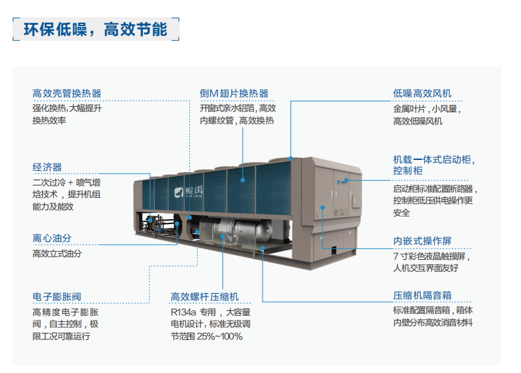 美的鲲禹高效空气源螺杆式热泵机组,采用高能效的半封闭双螺杆压缩机,高效壳管换热器及高效倒M型翅片换热器,通过电子膨胀阀控制技术,使机组能在工作范围内以节能的模式满足用户的需求。机组采用R134a环保制冷剂,产品获得AHRI认证、CRAA认证及节能认证并进入政府采购清单。