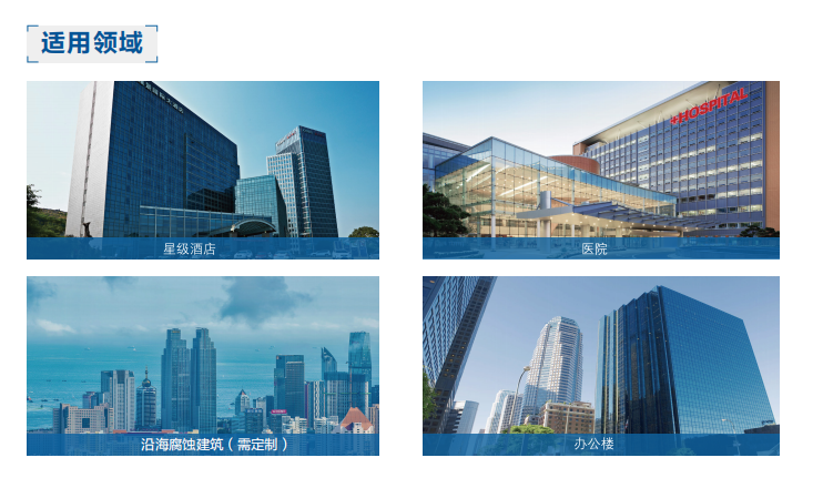 产品广泛应用于大中型商业、民用或工业建筑,也可应用于重度耐盐地区及重防腐地区。