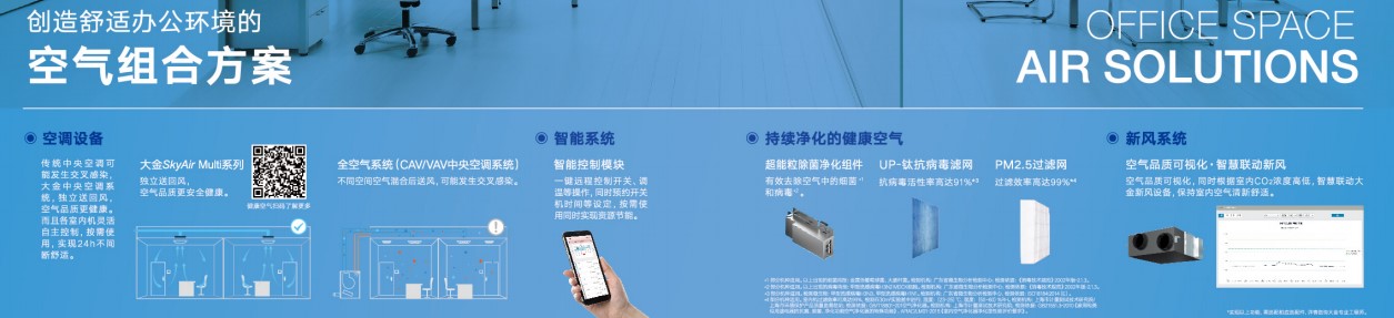 •公共空间空气问题往往更加复杂:空气品质问题,已经成为全民热议的话题无论是办公室、4S店铺、工厂还是餐饮等都由于人群相对集中、空气不流通等问题,容易造成室内污染深耕研究空气领域90余年的大金提供更专业、更有针对性的空气综合解决方案。